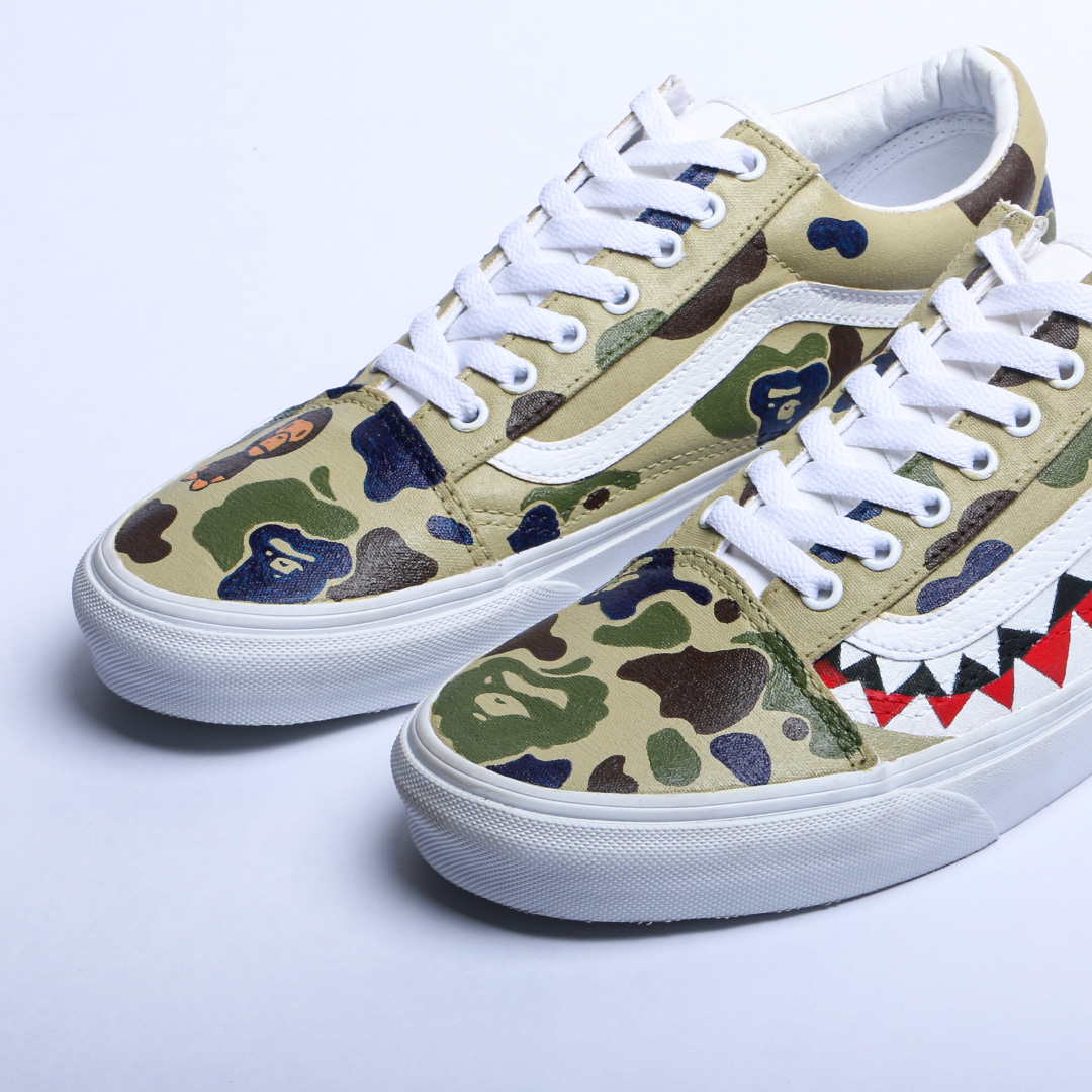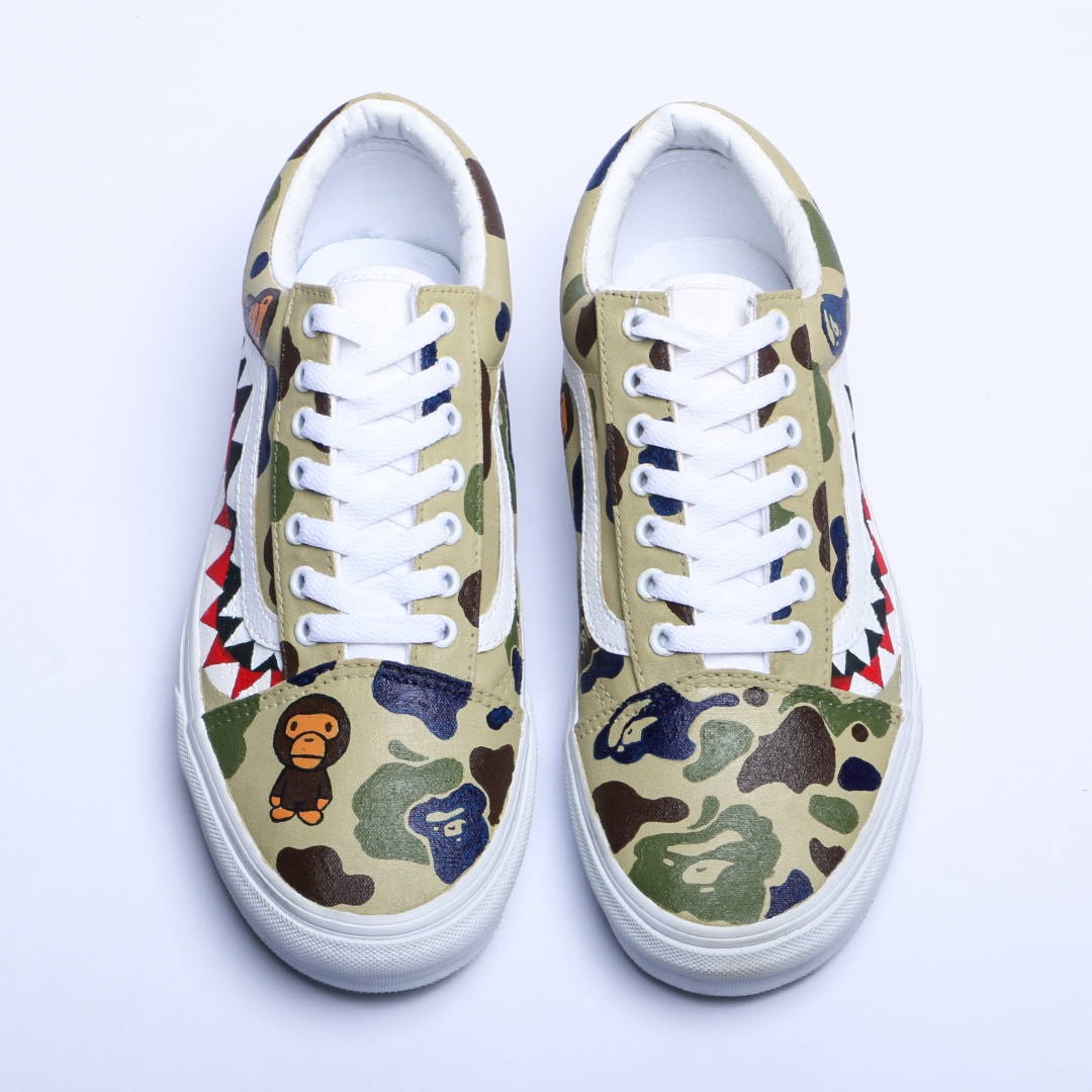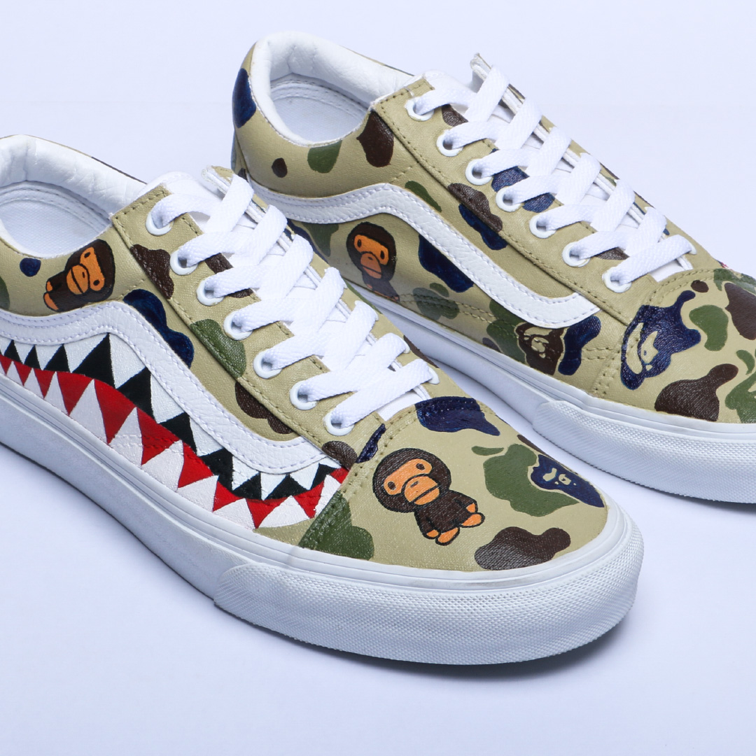 Unleash your wild side with Ape Rage, a bold reimagination of streetwear legends. Featuring a hand-painted camo base, shark-tooth side panels, and the iconic ape motifs, this custom Vans Old Skool is a collision of raw street energy and fierce individuality. Inspired by the legacy of BAPE and the aggression of classic shark graphics, these kicks are made to roar, not whisper.