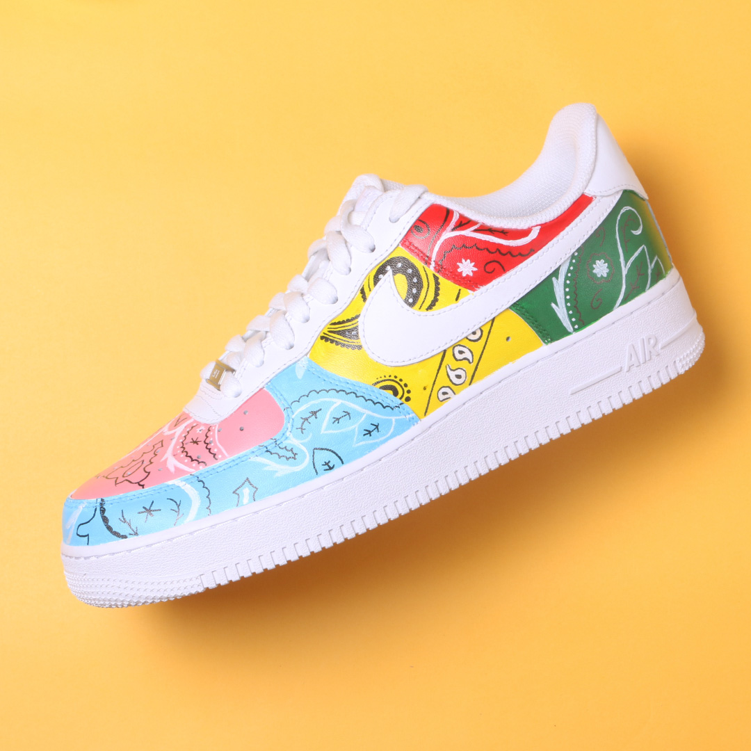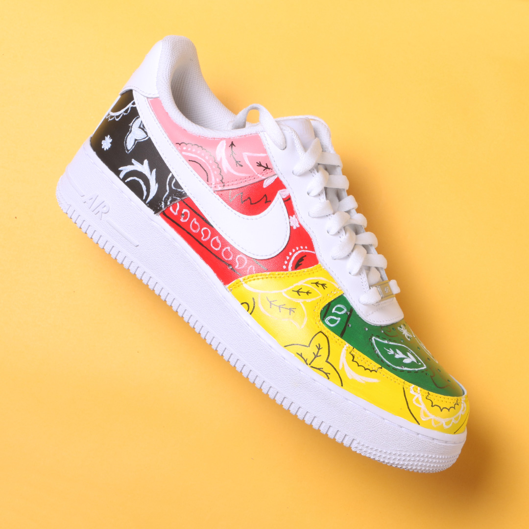 These Air Force 1 customs remix the classic bandana print into a vibrant patchwork of red, yellow, blue, green, black, and pink — each panel telling its own story. From block parties to bold statements, these sneakers celebrate unity in diversity with a playful yet powerful visual language. Crisp white leather meets chaos and harmony in equal measure. Pure energy, stitched together with style.