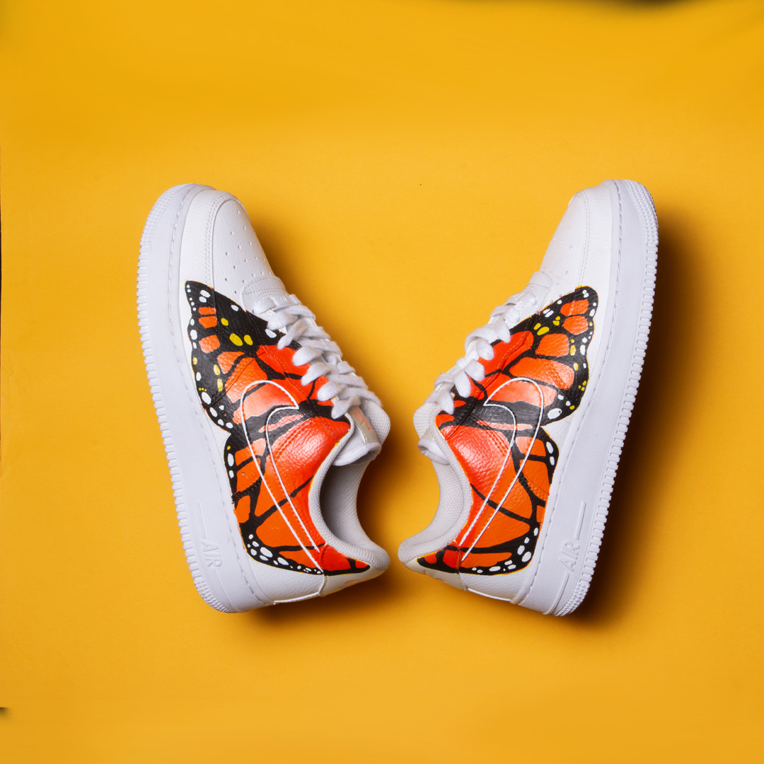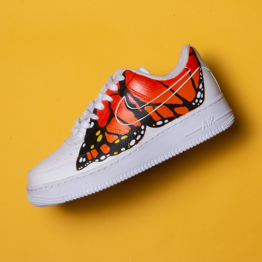 Take flight in style with Flutter Force, where elegance meets edge. These one-of-a-kind Air Force 1s feature hand-painted monarch butterfly wings in vibrant shades of orange, black, and gold, fluttering across a crisp white leather canvas. Designed for the bold and the free-spirited, these kicks transform every step into a statement. Whether you’re strutting the streets or turning heads at brunch, Flutter Force is your go-to for fearless femininity and fresh style.