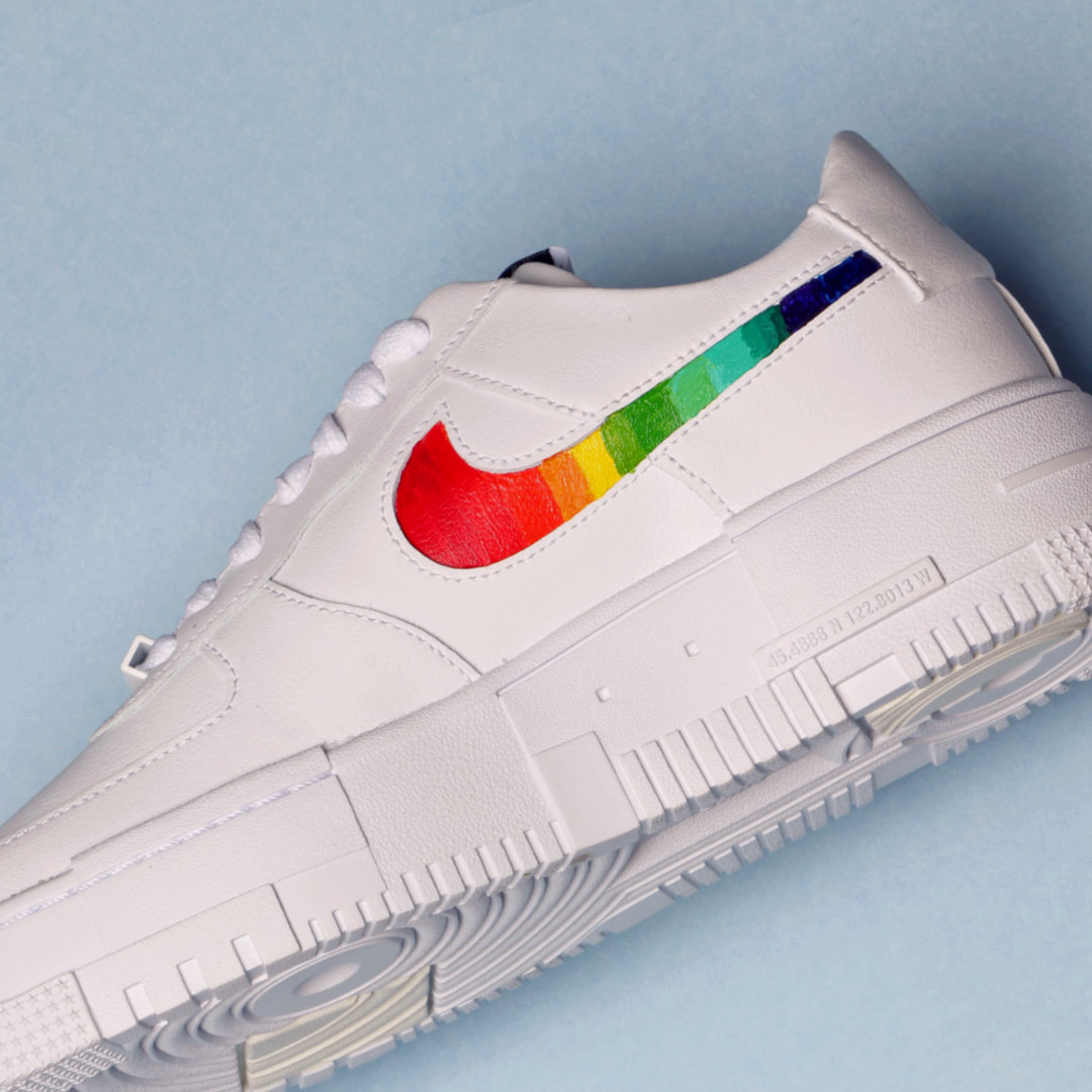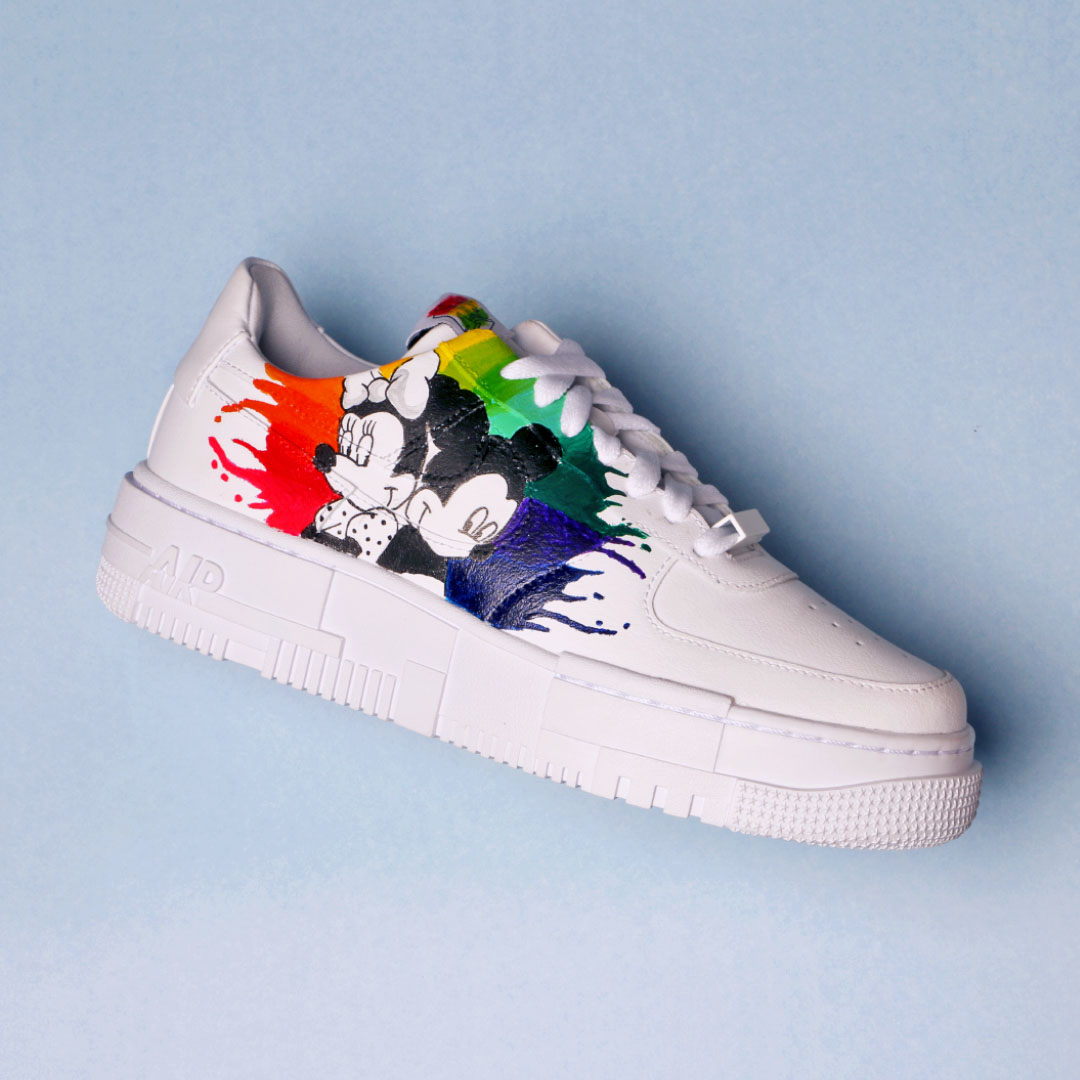 In Living Color is a playful fusion of nostalgia and bold expression, featuring hand-painted illustrations of the iconic Mickey & Minnie Mouse duo set against a vivid rainbow splash. Custom-designed on Nike’s Air Force 1 Shadow, this pair is loud, loving, and unapologetically fun — a celebration of timeless love wrapped in contemporary flair.