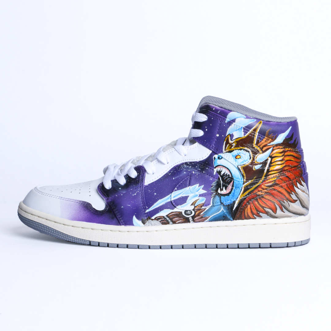 Forged in the spirit of the Ancients, Thronebreakers is a hand-painted tribute to Dota 2’s eternal clash between Radiant and Dire. The left shoe channels the stormy rage of heroes like Zeus and Invoker, painted in electric blues with raw divine energy. The right shoe erupts in cosmic fury, echoing the mystical force of Terrorblade, Invoker’s Dark Artistry, or Outworld Destroyer, wrapped in a starry void.