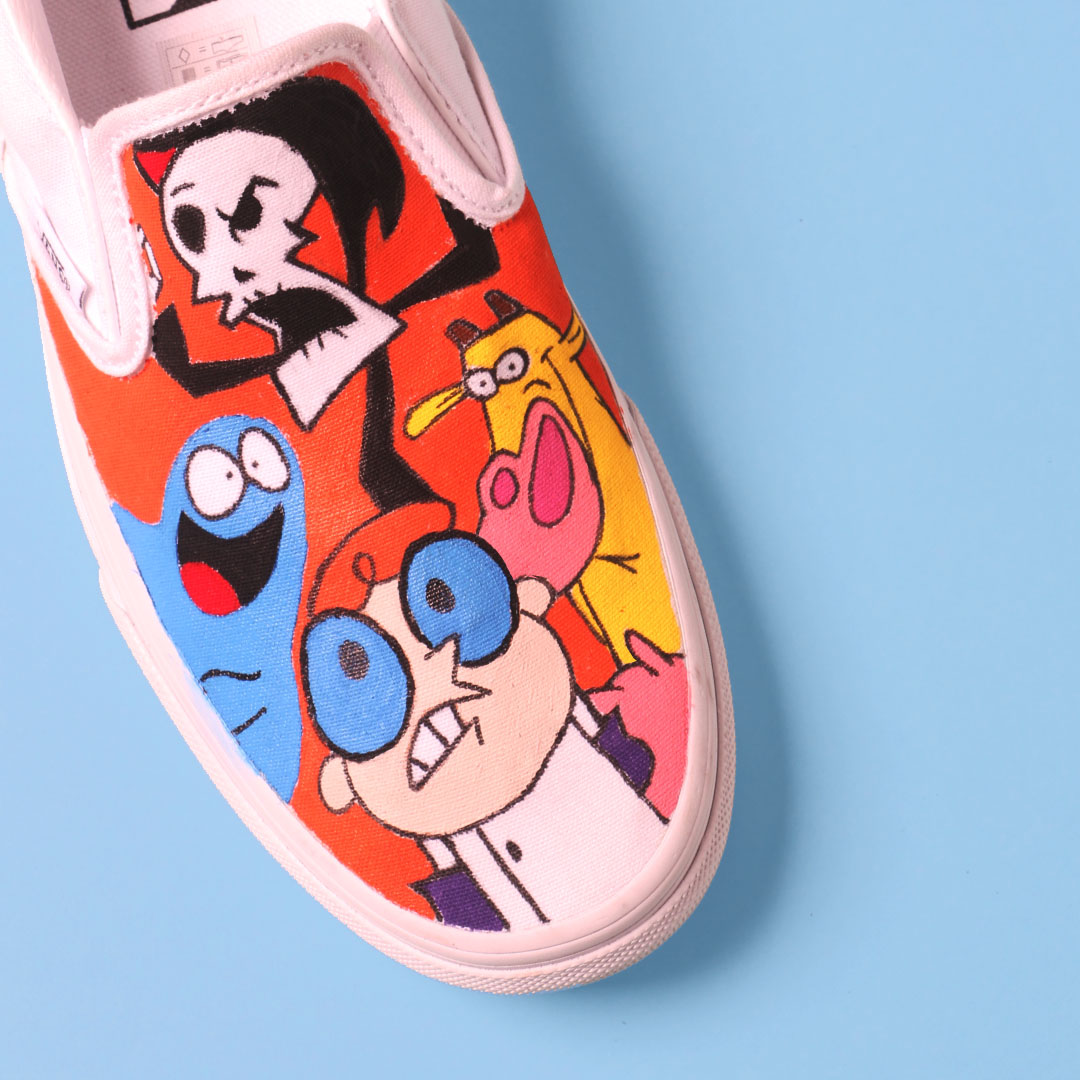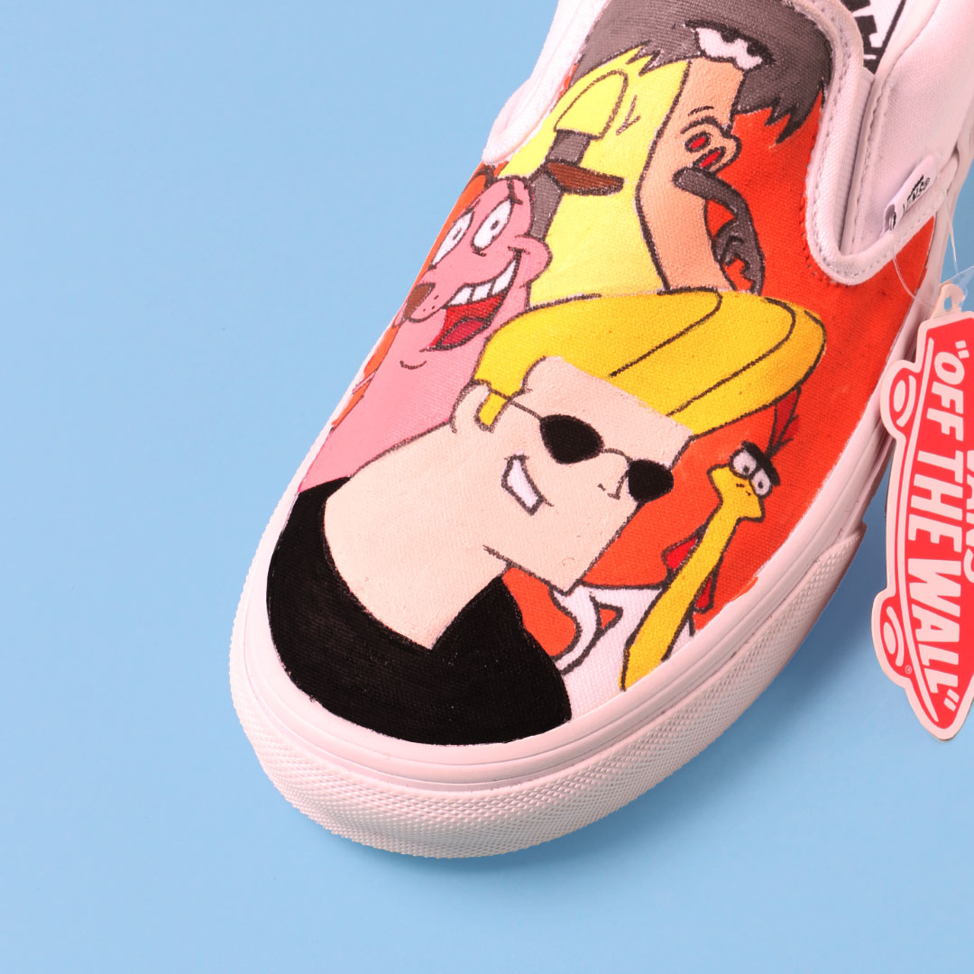 Relive the golden era of cartoons with these bold and nostalgic hand-painted Vans featuring iconic characters from classic Cartoon Network shows. From Johnny Bravo’s slick swagger to Dexter’s scientific scowl, Courage’s anxious stare to Grim’s deadpan vibe, each panel bursts with color and character. Set against a fiery orange backdrop, this pair captures the wild, chaotic, and unforgettable energy of Saturday morning TV. Perfect for the 90s kid who never really grew up — because some cartoons are forever.