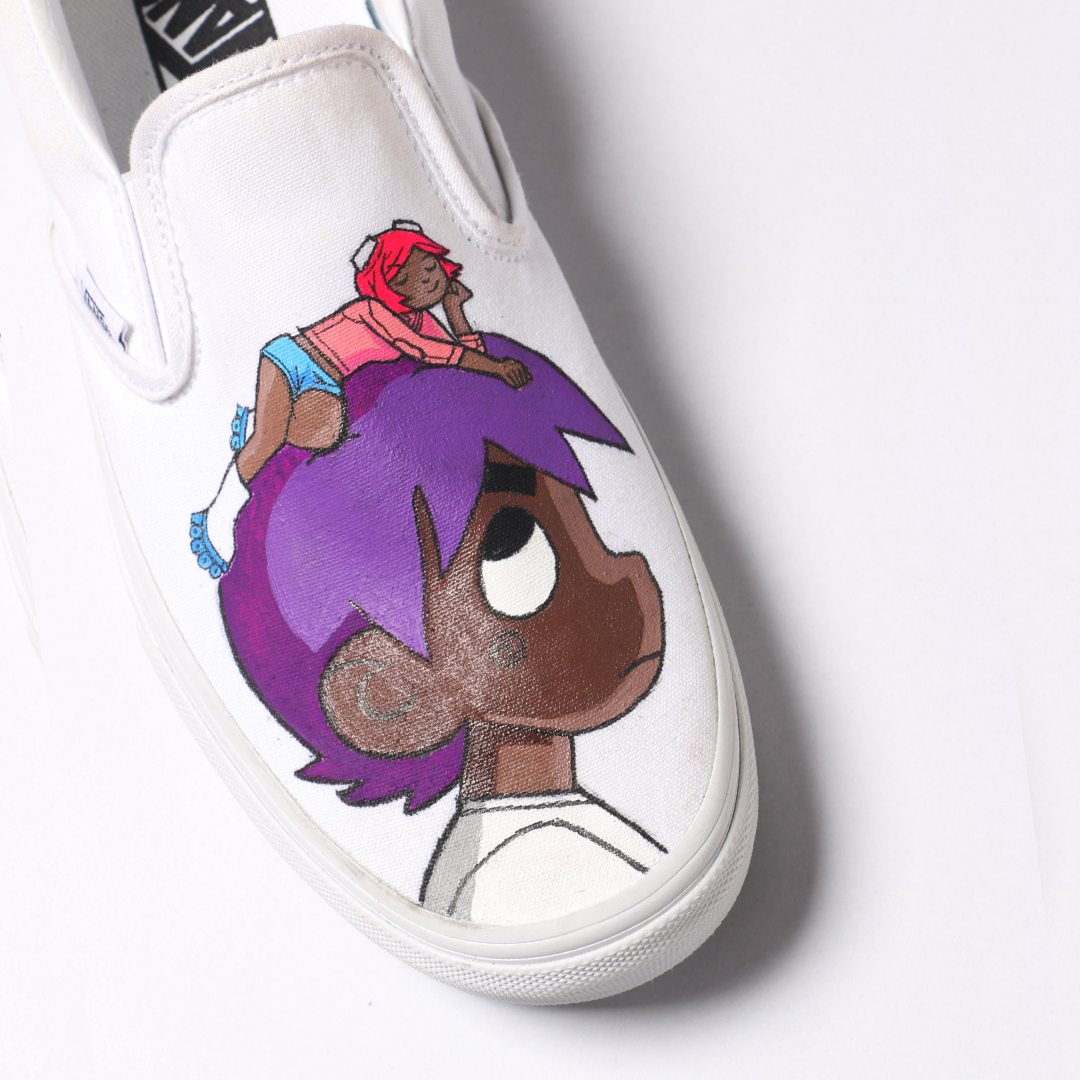 A bold tribute to the surreal, anime-inspired universe of Lil Uzi Vert, these custom hand-painted Vans slip-ons bring chaotic energy and youthful rebellion to your every step. One shoe captures a dreamy character with purple hair and a chill demeanor, while the other bursts with a riot of symbols — from dollar signs to cartoon faces — layered in vibrant neons and pastels. This pair is for the ones who live in their own world and wear their imagination loud.